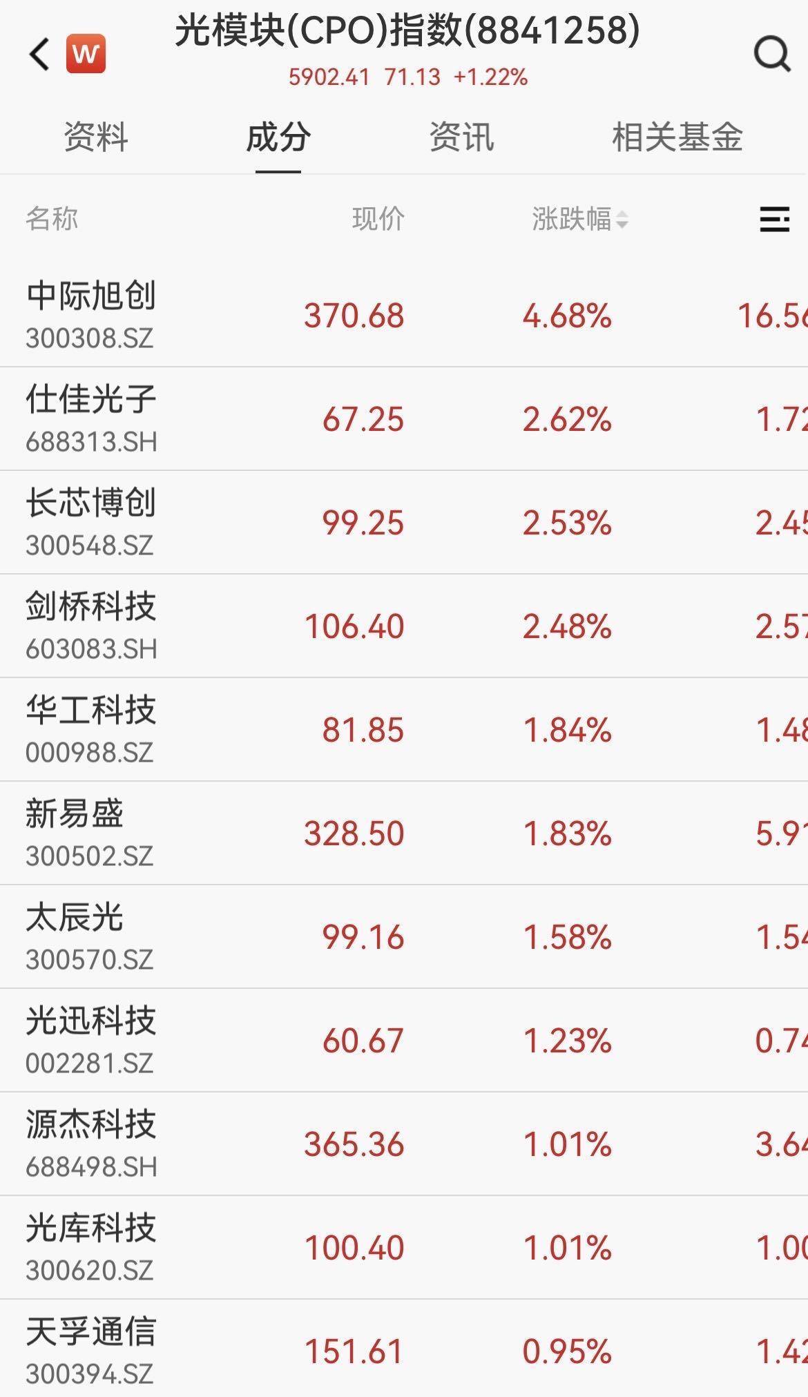 10月16日,光模块CPO概念板块集体回暖,中际旭创(300308.SZ)、新易盛(300502.SZ)、天孚通信(300394.SZ)等核心龙头低开高走,盘中集体翻红。截至午盘,中际旭创涨4.68%,股价重回370元/股股票配资网,报370.68元/股、新易盛、长芯博创(300548.SZ)、天孚通信、光库科技(300620.SZ)等纷纷跟涨。